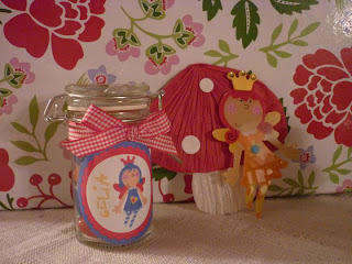 Con las hadas diseñé las pegatinas y las etiquetas, hice las guirnaldas, los botecitos de gominolas para regalar, las pajitas y la camiseta...y pensé...si yo tuviera 10 años como me gustaría que me regalasen "esas cosas"? Se me ocurrió que prepararlo por separado y meterlo en una caja todo colocadito me encantaría. También le hice cuatro pompones gigantes de papel de seda para colgar, pero esos iban aparte, claro.
